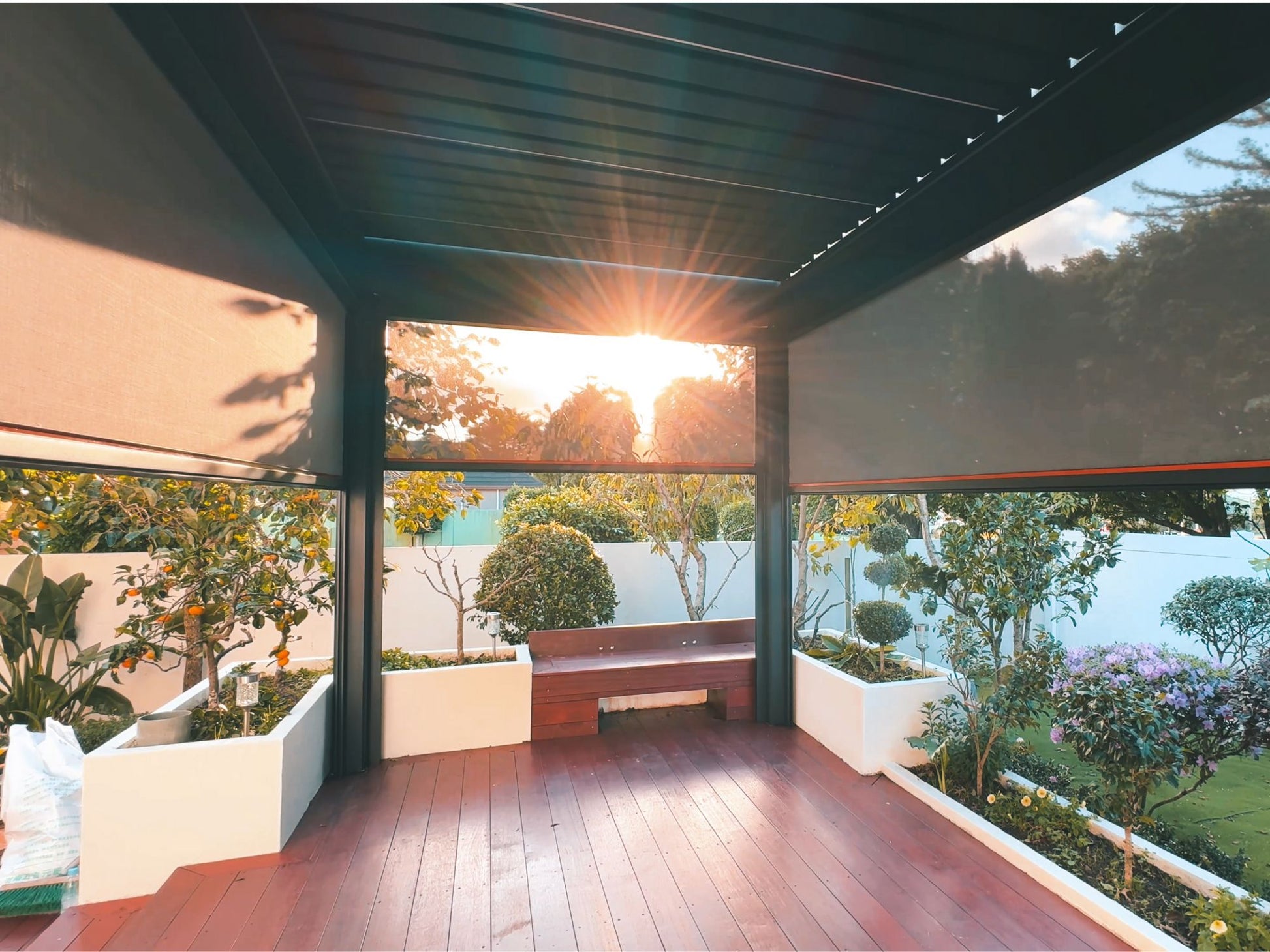 An elegant Aluminium pergola system designed to shelter your outdoor entertainment area from harsh sun and rain so that you can enjoy the outdoors in perfect comfort.
